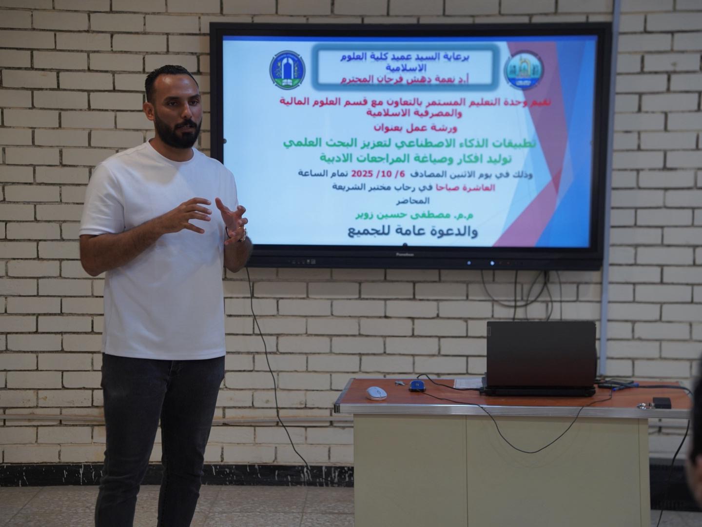 The College of Islamic Sciences at the University of Baghdad organized a workshop entitled “Artificial Intelligence Applications for Enhancing Scientific Research, Idea Generation, and Literature Review Composition,” presented by Assistant Lecturer Mustafa Hussein Zuwair.