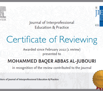 Professor from the college of nursing is selected as a reviewer of an American journalEnglish Admin10/03/2022Dr. Mohammed Baqer Abbas al-Jubouri, a professor at the college of nursing was selected recently to be a reviewer of ...