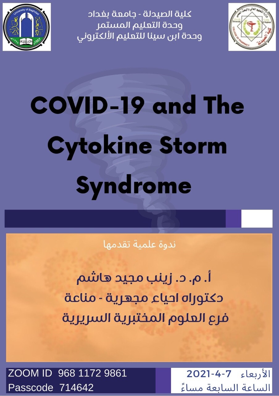 The college of pharmacy at the University of Baghdad has organized recently an electronic workshop entitled “Covid-19 and the Cytokine Storm Syndrome” delivered by Assist. Prof. Dr. Zainab Majid al-Hakim, a faculty member at the clinical laboratory sciences branch with the aim to highlight the most important syndrome significantly linked to the risk of Covid-19 infection.