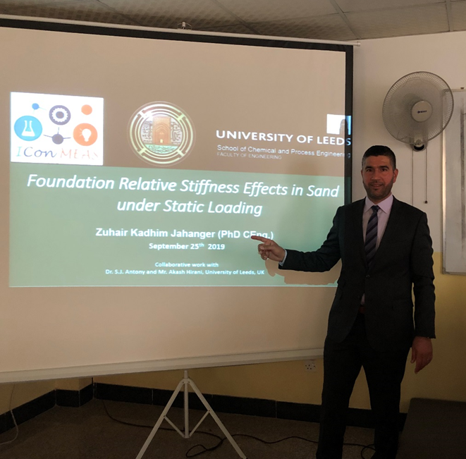 Dr. Zuhair Kadhim presented a research paper entitled “Foundation relative stiffness effects in sand under static loading” in which he investigated the behavior and effects of relative stiffness in stress distribution and soil deformation field by using a compression test for smooth strip foundations on sand surface of different packing densities. Nine experimental tests were used for three foundation materials (plastic (P), rubber (R) and aluminum (A)) that differ in relative stiffness along with three densities of sandy soils. The researcher tried to determine the failure mechanism using digital particle image velocimetry (DPIV) measurement in order to carry out several careful analyses of stress, failure mechanisms and velocity fields.