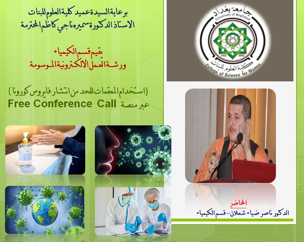The department of chemistry at the college of science for women held a virtual workshop on (Using sterilizers to reduce the spread of the Coronavirus) presented by Dr. Dhiaa Nasser Shaalan via FCC platform with the participation of a large number of professors and students concerned in this matter. The workshop aimed to explain the dangers of not using disinfectants and sterilizers correctly and in the quantities required to fulfill their purpose and their excessive or inappropriate use that may lead to many symptoms, including itching, skin abnormalities or allergies.