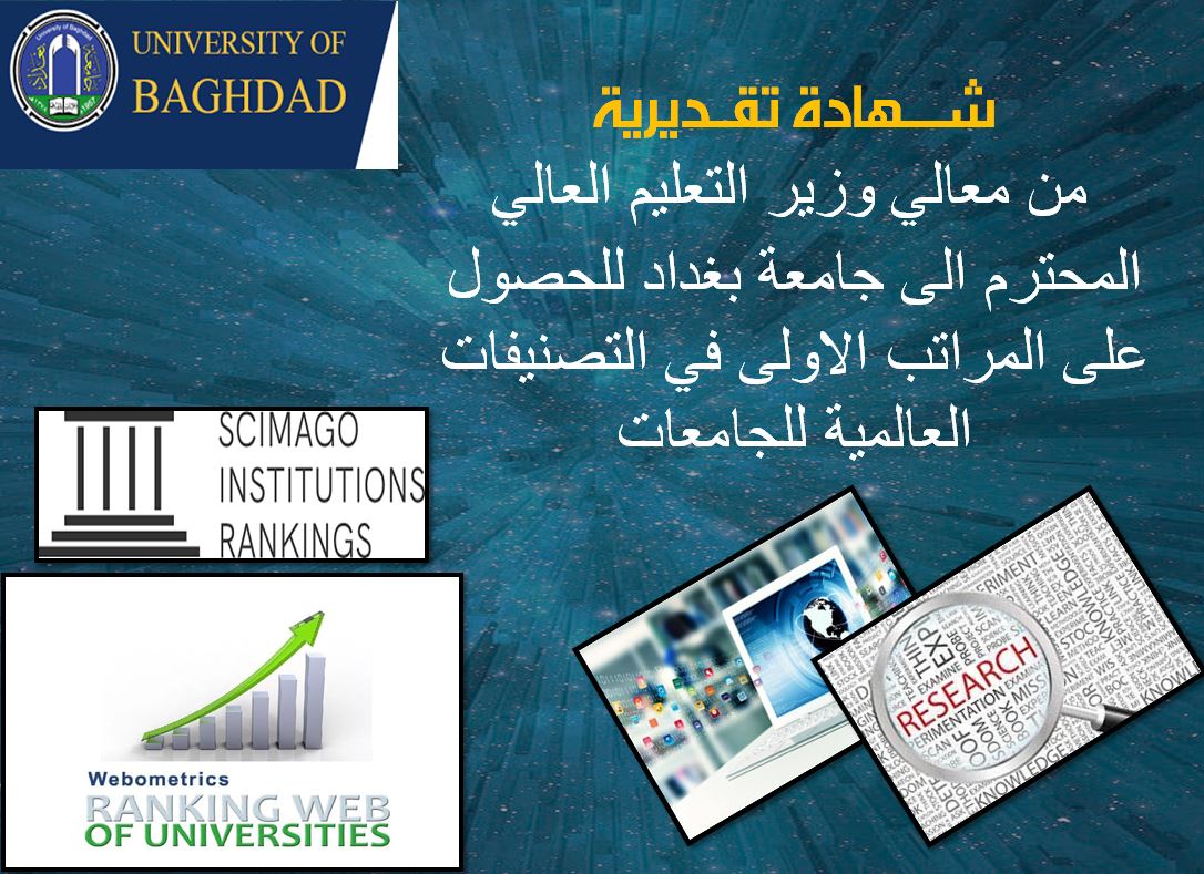His Excellency, the minister of higher education and scientific research, Prof. Dr. Nabil Kazem Abdul Sahib dedicated a certificate of appreciation to the University of Baghdad for its efforts exerted towards getting the first ranks in international rankings at the local level, namely in Scimago Institutions Rankings and in Webometrics Ranking of World Universities issued in late January.
