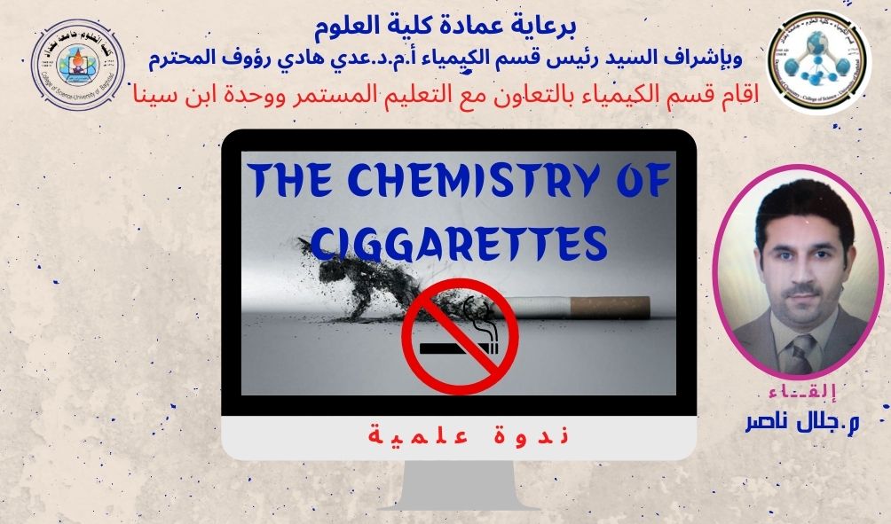 The department of chemistry, in cooperation with Ibn Sina unit for e-learning and the continuing education unit at the college of science organized a virtual scientific lecture entitled “The chemistry of cigarettes” given by the Lecturer Jalal Nasser with the participation of a number of students and specialists in medical affairs.