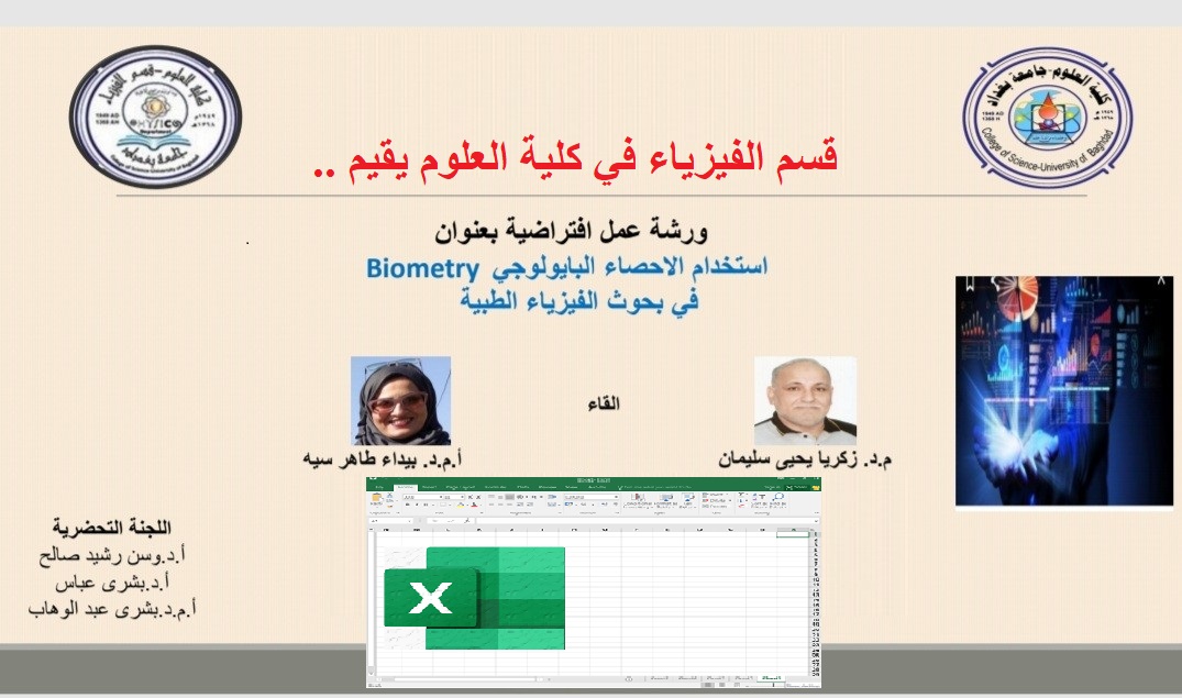 The department of physics, in cooperation with Ibn Sina unit for e-learning and the continuing education unit at the college of science has organized recently a virtual workshop entitled “Using biometry in medical physics research” presented by the lecturer Dr. Zakaria Yahya Suleiman and Assist. Prof. Dr. Baidaa Tahir Syeh with the participation of a number of students and those concerned with statistical and biological affairs.