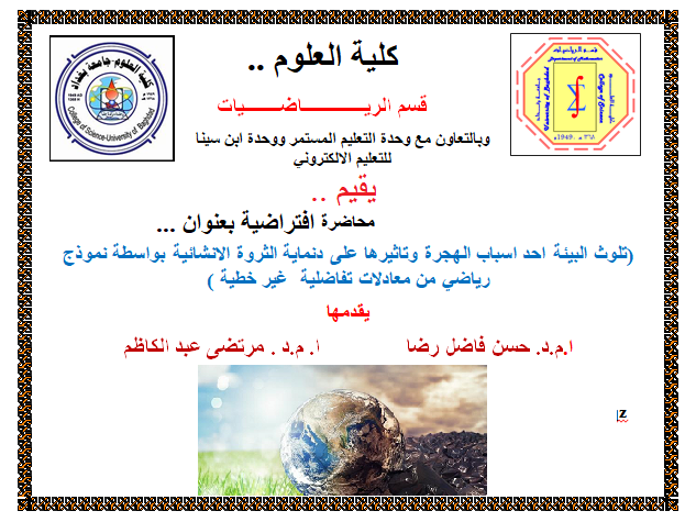 The department of mathematics, in cooperation with Ibn Sina unit for e-learning and the continuing education unit at the college of science held a virtual lecture entitled “Environmental pollution as one of the causes of migration and its impact on wealth index construction: a mathematical model of nonlinear differential equations” delivered by Assist. Prof. Dr. Hassan Fadhil Ridha and Assist. Prof. Dr. Murtadha Abdul Kazim with the participation of a number of professors, students and those concerned with environmental, agricultural and mathematical affairs.