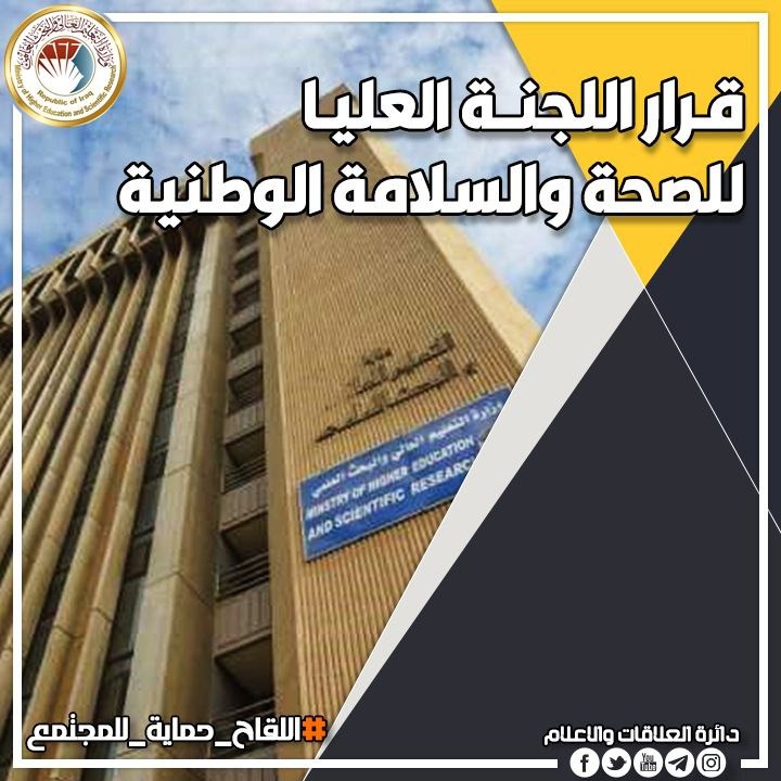 In order to preserve the public health of the community and in compliance with the resolutions of the Supreme Committee for National Health and Safety No. 26 of 2021, the Iraqi ministry of higher education and scientific research announced to receive only vaccinated people in its departments or those who have a negative PCR test result weekly. So in order to ensure a safe and a healthy environment for all people, the ministry invites all its staff, faculty members and students to be engaged in its major vaccination campaign in all public & private educational institutions.
