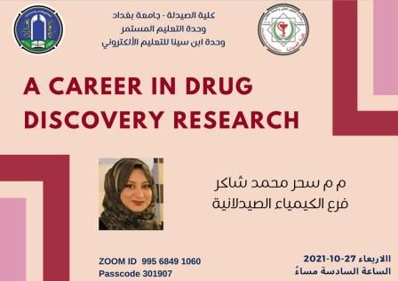 The college of pharmacy at the University of Baghdad has organized an online workshop entitled “Career in drug discovery research” delivered by the Assist. Lecturer Sahar Mohammed Shaker from the Pharmaceutical Chemistry Branch via Zoom platform.