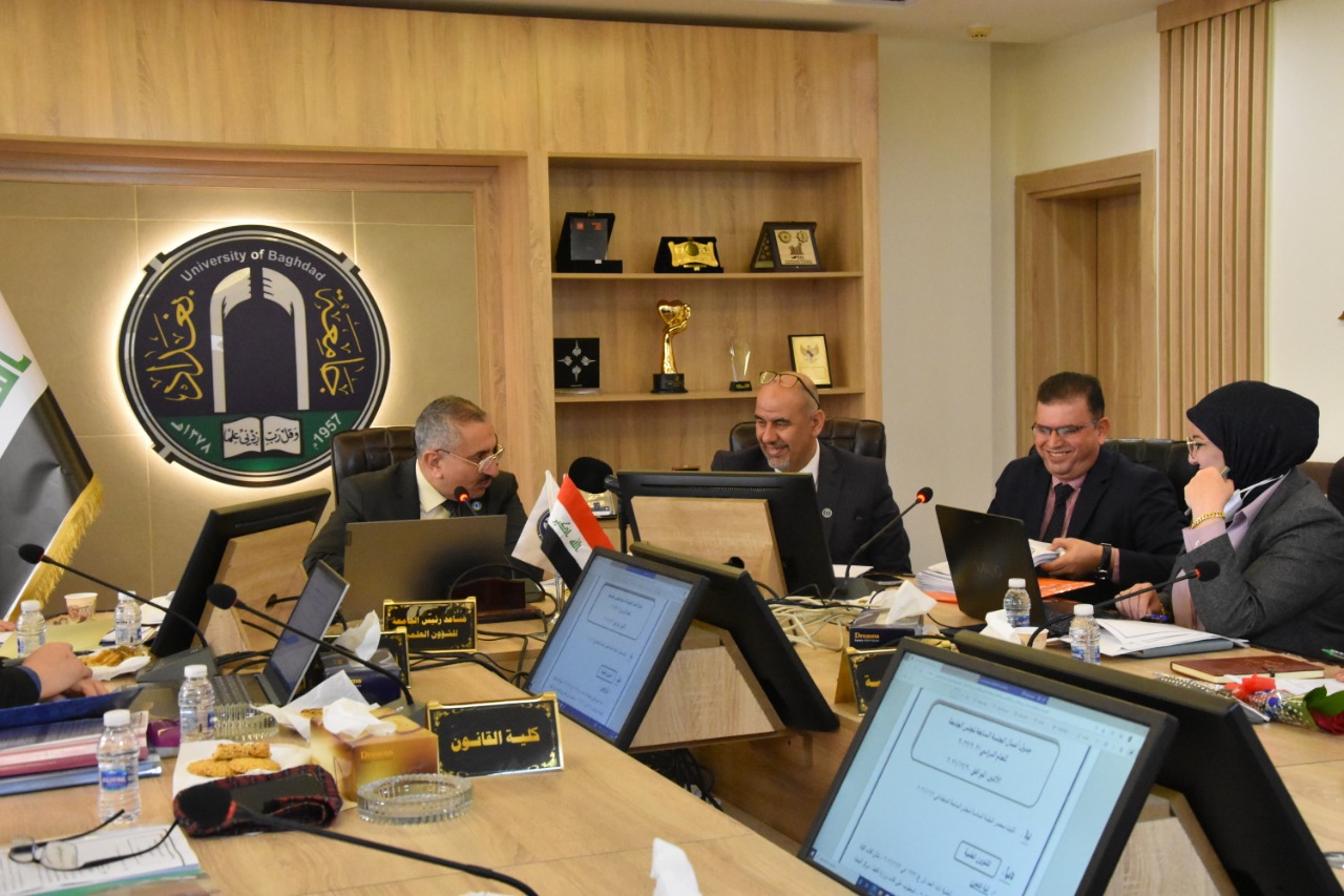 The council of the University of Baghdad held its seventh session under the chairmanship of Prof. Dr. Munir Hamid al-Saadi and the membership of his assistants for scientific & administrative affairs and the council secretary, in the presence of all members, deans of faculties, postgraduate institutes and centers to discuss a number of issues on the agenda. The members at first praised the role of the department of Diwan affairs in cooperation with most of the formations in the establishment of the flower exhibition in the campus, followed by reading Surah al-Fatiha for the spirits of two faculty members, i.e, the dean of the college of physical education and sports sciences Prof. Dr. Qassim Mohammed Hassan al-Khaqani, as well as the Assist. Prof. Dr. Zahra Hussein Mahdi from the department of biology at the college of education for pure and applied sciences (Ibn al-Haitham) whose scientific promotion to professorship is approved in this session.