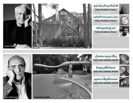A group of students from the second grade at the department of architecture engineering have conducted a study and an analysis of a range of international projects made by some pioneer architects including the houses made by: Le Corbusier, Walter Gropius, Mis Vandero, Frank Lloyd Wright, Oscar Niemeyer, Tadao Ando, Hassan Fathy and Harry Seidler. Each student studied the models they have chosen according to architectural trends and movements and they redraw charts to find out the internal and external efficacy of these residences with a study of their volumes and spaces by making prototypes.