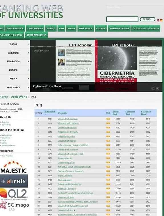 The University of Baghdad was ranked in the first position in Iraq according to the new edition of Webometrics Ranking of World Universities for January 2022 by getting the (1857) position globally according to the indicators obtained during this month. Based on the most current and updated web data, this edition showed an increase in the number of Iraqi universities and colleges that entered in this world university ranking, where (79) Iraqi public and private universities and colleges have competed in this ranking in January 2021.
