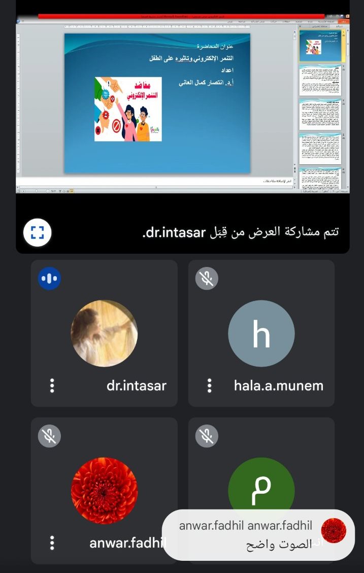 The Department of Home Economics, in collaboration with the Continuing Education Unit at the College of Education for Women, hosted a lecture entitled “Cyber bullying and its implications for children” presented by Prof. Dr. Intisar Kamal al-Ani via the Google Meet service.
