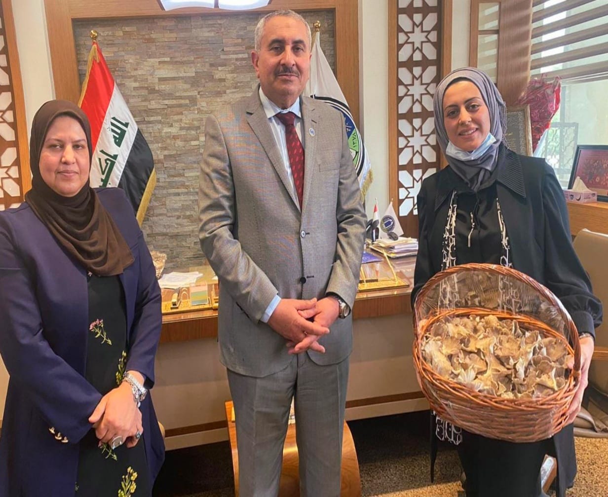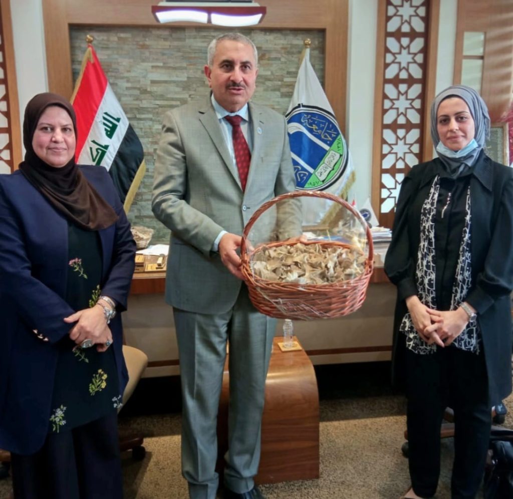 The study highlighted the possibility of cultivating wild fungi scattered in the Iraqi environment and adding new strains comparable to their productivity and nutritional properties, foreign breeds of these species, which are imported in hard currency, Pleurotus is one of the world’s second most edible food fungi in terms of production among other fungi and has a high nutritional value due to its high protein content and amino acids necessary for the human body as well as vitamins and mineral elements, as well as its low fat content as well as containing many compounds and enzymes that are highly bioactive so it is a healthy balanced food alternative to meat when following a free diet, in addition to the possibility of producing it using low-cost farming methods based on the available agricultural waste in the country. The rector of the University of Baghdad, Prof. Dr. Munir Hamid al-Saadi, expressed his congratulated this outstanding scientific achievement and dedicated a book of thanks and appreciation to all participants in this quest as a result of their efforts to raise the name of the University in Baghdad and the name of Iraq in global forums.