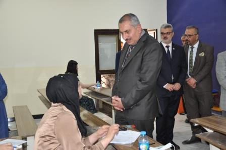 Prof. Dr. Munir Hamid al-Saadi, rector of the University of Baghdad, accompanied by his assistant for scientific affairs, Prof. Dr. Marwan Ashour and the director of Ibn Sina Center for E-Learning, Assist. Prof. Dr. Mohammed Sadiq, have inspected the final examinations of undergraduate students taking place at the college of administration and economics.