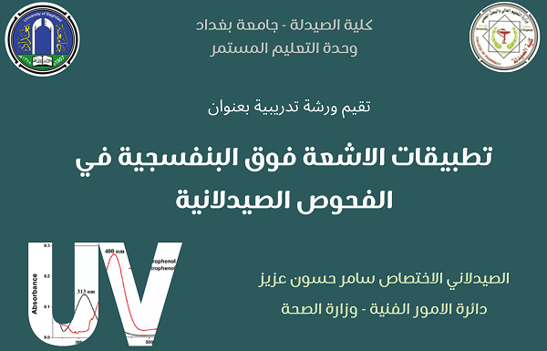 The Pharmaceutical Branch at the College of Pharmacy has organized a training workshop entitled (Principles and Applications of Ultraviolet Radiation in Pharmaceutical Examinations) with the participation of the Technical Affairs Department at the Ministry of Health and that was represented by the pharmacist Samer Hassoun Aziz.