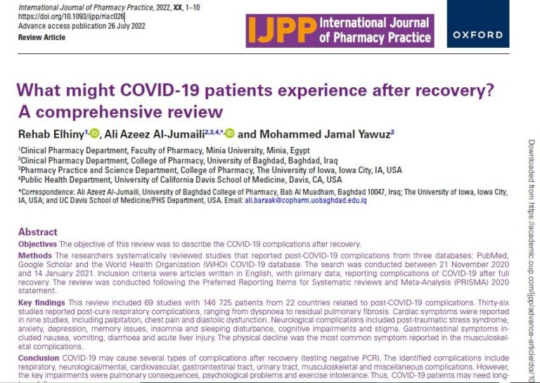 Prof. Dr. Ali Azeez Ali and Prof. Dr. Mohammed Jamal Yawuz, faculty members from the department of clinical pharmacy at the University of Baghdad has recently published a comprehensive review on the complications of Covid-19 in the latest issue of the International Journal of Pharmacy Practice (IJPP), that included 69 studies involving more than (146000) patients from 22 countries on health complications that can remain for several months after recovery from infection of this pandemic. It is noteworthy that this journal is registered in Scopus and Clarivate Analytics databases, being one of the leading peer-reviewed journals publishing innovative research in the context of pharmacy, medicines, and healthcare. This review was accomplished in collaboration with Dr. Rehab el-Hiny from the Faculty of Pharmacy, Minia University in Egypt.