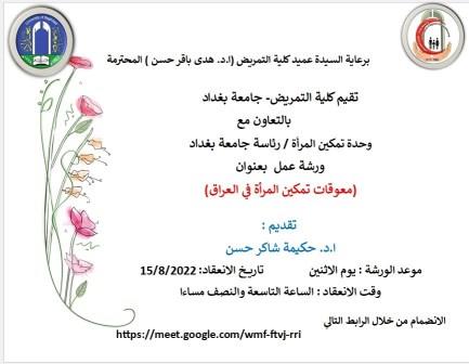 The college of nursing at the University of Baghdad has lately organized a virtual workshop entitled (The obstacles to empowering women in Iraq) via the Google Meet service, in the presence of a number of professors and undergraduate students. The participants aimed to identify and shed light on the obstacles in women’s decision-making in Iraq through reviewing some social values and standards, family upbringing and principles of women’s self-awareness in the community. The lecturers called for re-educating individuals in line with educational curricula and public awareness ethics via TV shows, series & movies, so that women can be rehabilitated and respected as full partners in building the nation.