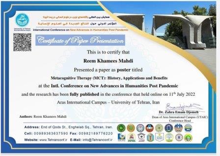 Dr. Reem Khamis Mahdi, a professor from the empowerment and capacity building research department at the women’s studies center at the University of Baghdad has participated in the proceedings of the “International Virtual Conference on New Findings in Humanities” sponsored by the University of Tehran in cooperation with a large number of universities around the world including the University of Baghdad. Dr. Reem Khamees Mahdi presented a research paper entitled “Metacognitive Therapy (MCT): History, Applications and Benefits” in which she studied the latest methods of psychotherapy for psychological and mental disorders in the cognitive method.