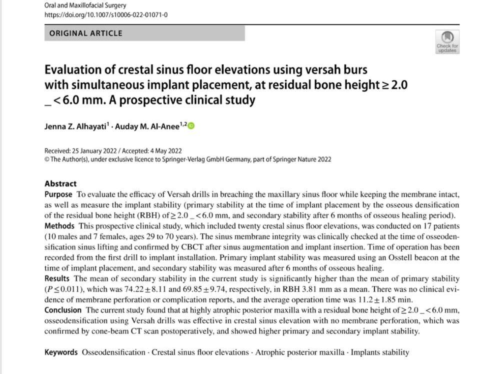 Assist. Prof. Dr. Uday Mahmoud, a lecturer from the Maxillofacial Surgery Branch at the college of dentistry has published two papers in Scopus Q2 journals, the first one is entitled (Evaluation of crestal sinus floor elevations using versah burs with simultaneous implant placement at residual bone height ≥ 2.0 _ < 6.0 mm: A prospective clinical study). It dealt with a future clinical study including the evaluation of the lifting of the nasal sinus in the upper jaw by bone condensation with the placement of a direct dental implant. The study was carried out based upon 17 references with follow-up cases for 6 months and it concluded the effectiveness of this method of raising the nasal sinus with the implantation of the tooth at the same time in the upper jawbone of severe atrophy. It was published in the Oral and Maxillofacial Surgery, issued by Springer on 14/5/2022.