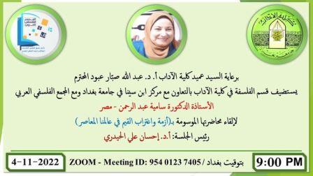 The Department of Philosophy at the College of Arts has organized an online scientific lecture entitled (The crisis and alienation of values in our contemporary world) in cooperation with Ibn Sina Center for E-Learning and the Arab Philosophical Academy. The lecture was presented by Prof. Dr. Samia Abdul Rahman from the Arab Republic of Egypt with the aim to create a system of values that frames the behavior of the individual and make him subject to practices and imbued with social values made by the same society where anyone who tries to penetrate it is considered as a lawbreaker of all the legislations and resolutions that any community has drawn up a long time ago so as to maintain social peace and coexistence among the components of the community.