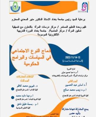 The Center for Women’s Studies has organized a virtual training course entitled (Integrating Gender in Government Policies and Programs) that lasted for two days. Dr. Shereen Muhammad Kazem from the department of sociology at the University of Baghdad, has participated in the first day with a research paper on a (Review of government programs and policies aimed at integrating gender after 2003), in which she clarified the concept of gender and the Iraqi experience in integrating gender into government policies and programs.
