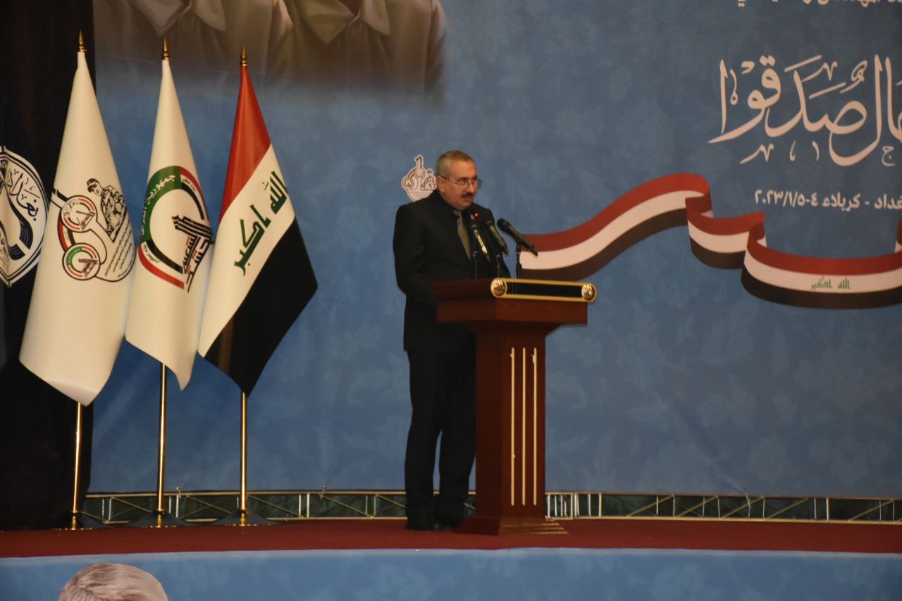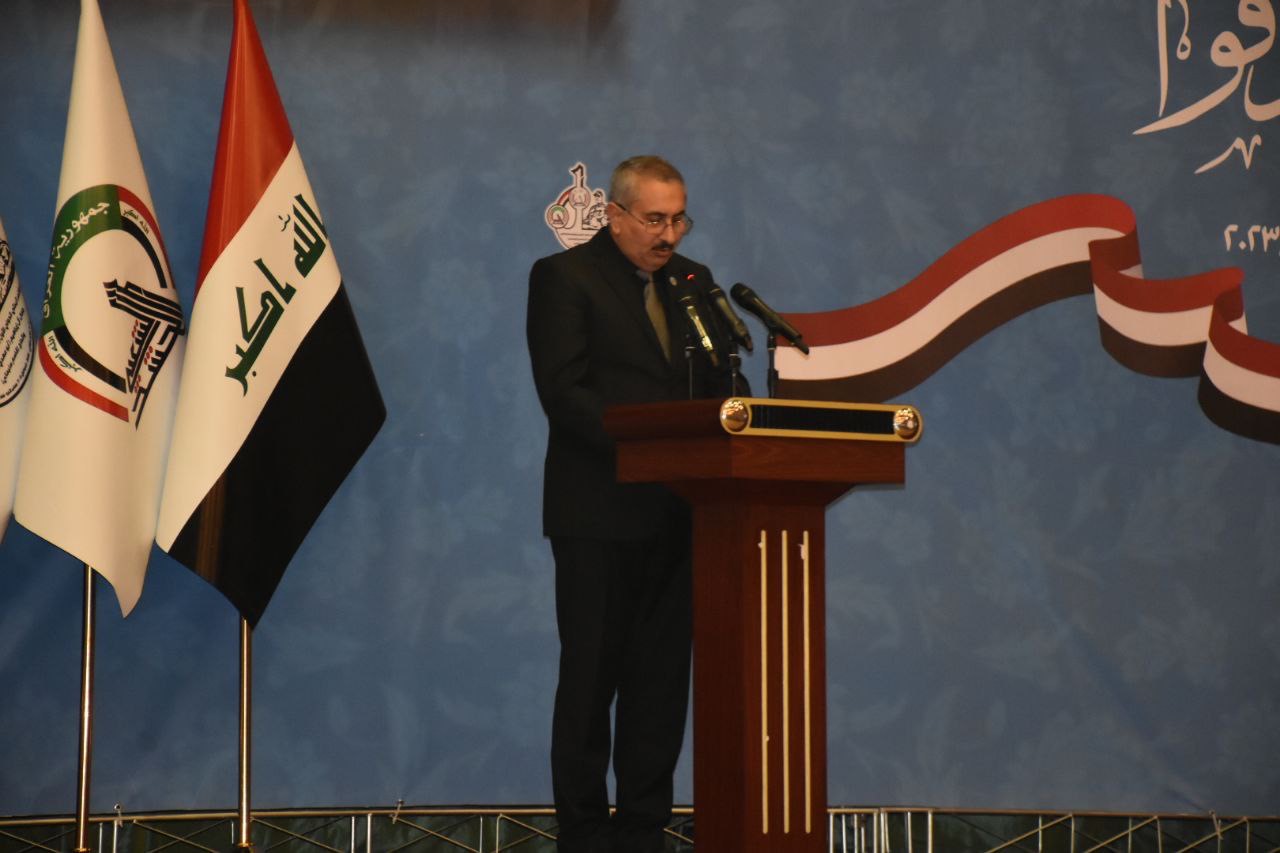 During his speech, the rector asserted that the cultural, intellectual and academic community bears a great responsibility in transferring the effects of the heroic epics written by the Iraqis, whether in the victorious Popular Mobilization Forces or the valiant security forces, indicating at the same time the role played by such conferences and other events to identify the necessary methodologies and plans to highlight the role of sacrifices and transfer their heroism and exploits to future generations. Dr. Munir al-Saadi also called for exerting maximum scientific, intellectual and research efforts to clarify the biography of great leaders, frame their lives and highlight their exploits and heroism in order to be a constant example for future generations on which the future of this nation is based.
