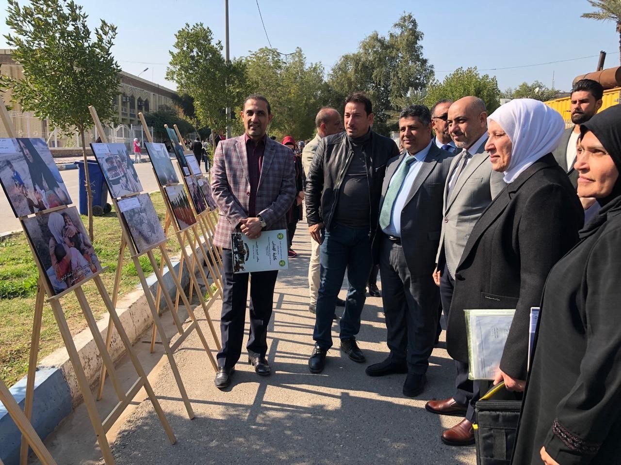 The Department of Student Activities at the Presidency of the University of Baghdad held an art exhibition to document the Yazidi genocide entitled (Between Terrorism and Humanity), under the auspices of the President of the University, Prof. Dr. Bahaa Ibraheem Ansaf, and in the presence of the Dean of the College of Arts, Prof. Dr. Ali Abdul Amir, the Dean of the College of Languages, Prof. Dr. Ali Adnan Mashoush, and the Director of the Student Activities Department, Dr. Ali Sadiq.