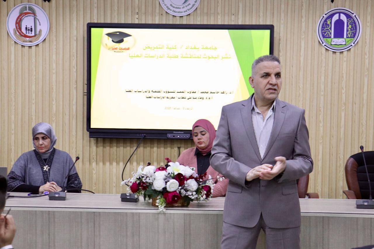The Division of Graduate Studies at the College of Nursing at the University of Baghdad, in cooperation with the Scientific Affairs Unit, organized an important workshop for graduate students (research year for master’s and doctorates) entitled “Instructions for discussing theses and theses”, in which Dr. Zahid Jassim Mohammed and Dr. Wafa Abdul Ali Hattab lectured, in the presence of graduate students.