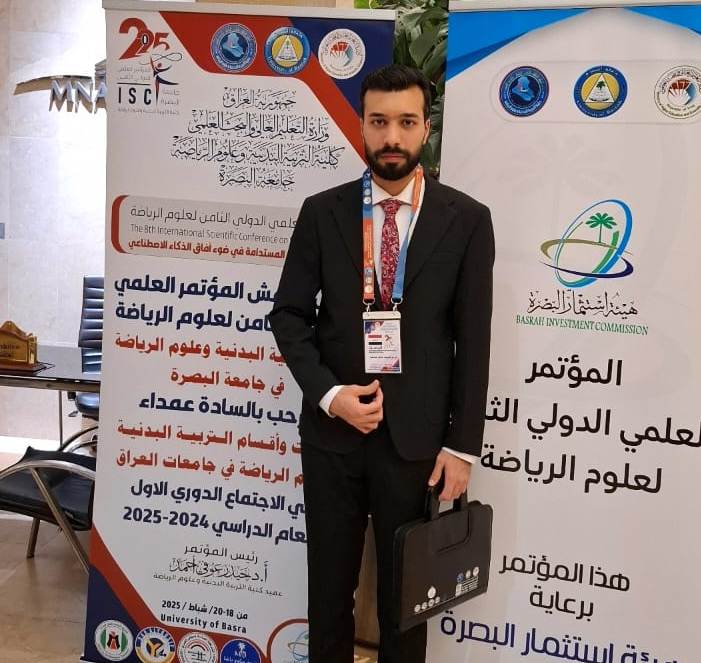 Assistant Lecturer Mohammed Mundher from the College of Engineering at the University of Baghdad participated in the 8th International Conference organized by the College of Education at the University of Basra, under the patronage of the Minister of Higher Education and Scientific Research. The conference was held under the theme “Sports and Sustainable Development in Light of Artificial Intelligence Horizons.”