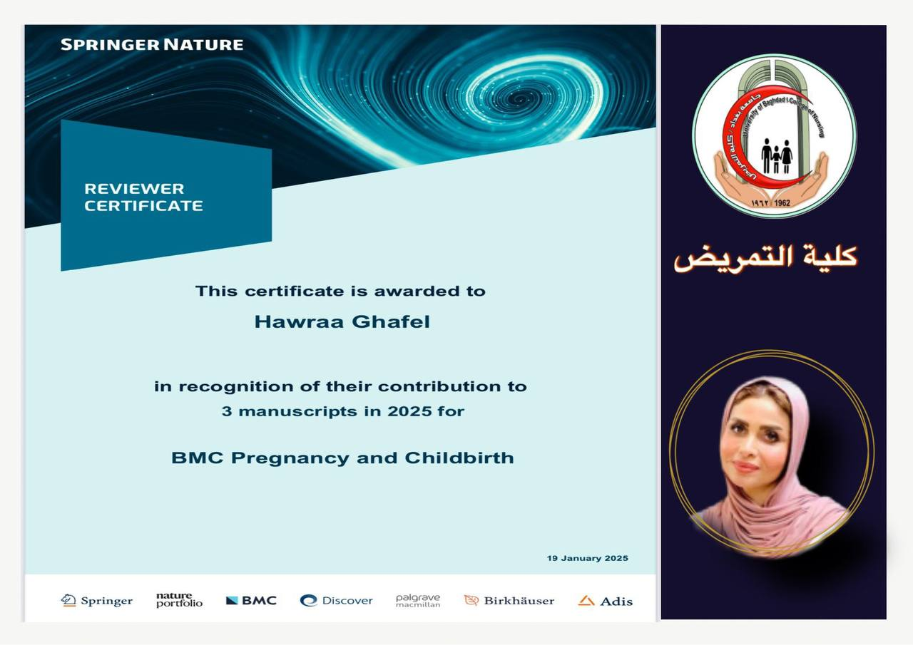 Assistant Professor Dr. Huraa Hussein Ghafil, a college member from the College of Nursing at the University of Baghdad, has been selected as a member of the prestigious journal Pregnancy and Childbirth, published by the global publishing house Springer Nature. This recognition comes as a testament to her extensive expertise and outstanding contributions to scientific research, including an impressive record of publications in renowned peer-reviewed journals, alongside her active involvement as a scientific committee member at numerous international and local conferences.