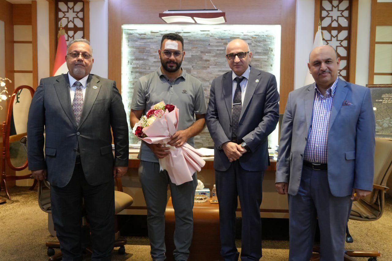The President of Baghdad University, Professor Dr. Bahaa Ibraheem Ansaf, accompanied by his scientific and administrative deputies, received student Mortada Jabbar Jari from the Mechatronics Engineering Department at Al-Khwarizmi College of Engineering to check on his health after he was involved in an accident on one of the university campus buses.