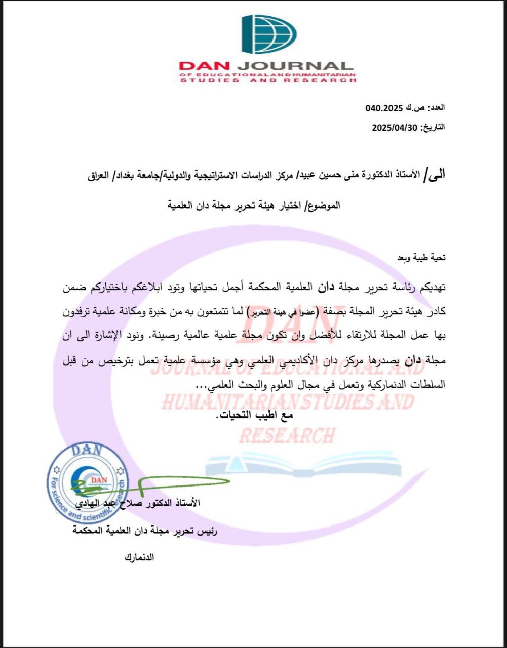 In a new academic achievement added to the credentials of the Center for Strategic and International Studies – University of Baghdad, Dr. Mona Hussein Obaid, a researcher at the center, has been selected as a member of the editorial board of the “DAN” academic journal, which is published by the DAN Academic Scientific Center in Denmark.