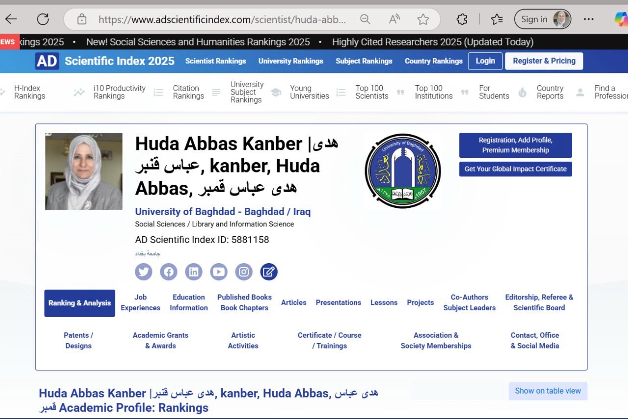 Professor Dr. Huda Abbas Qanbar, a faculty member at the College of Islamic Sciences at the University of Baghdad, has been included in the AD Scientific Index, an international scientific database, within the institutional ranking of the University of Baghdad and her specialized field of Information and Libraries.