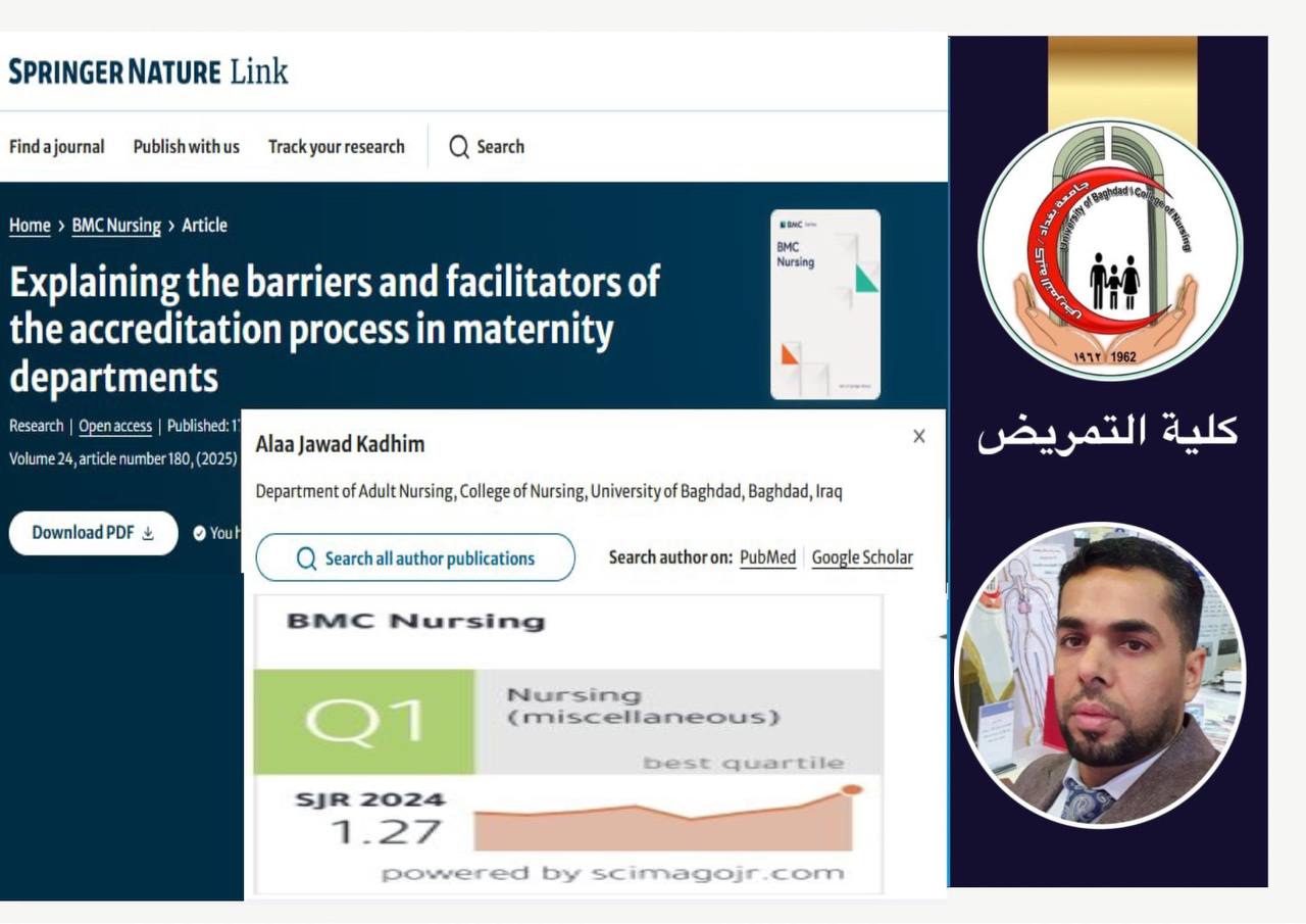 Assistant Professor Dr. Alaa Jawad Kazem, a faculty member at the College of Nursing at the University of Baghdad, has published a valuable research paper in BMC Nursing, one of the Q1-ranked journals under Springer Nature.