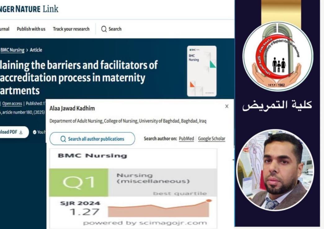 Assistant Professor Dr. Alaa Jawad Kazem, a faculty member at the College of Nursing at the University of Baghdad, has published a valuable scientific research paper in BMC Nursing, a journal classified within the first quartile (Q1) in Springer Nature.