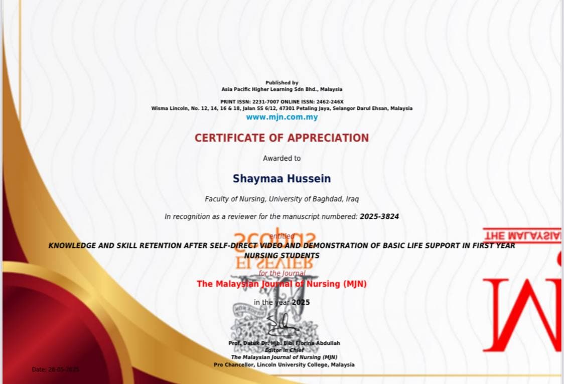 Dr. Shaima Mohammed Hussein, a faculty member at the College of Nursing, University of Baghdad, has been selected as a peer review board member for the evaluation of a research paper in The Malaysian Journal of Nursing, published by Asia Pacific Higher Learning Sdn Bhd.