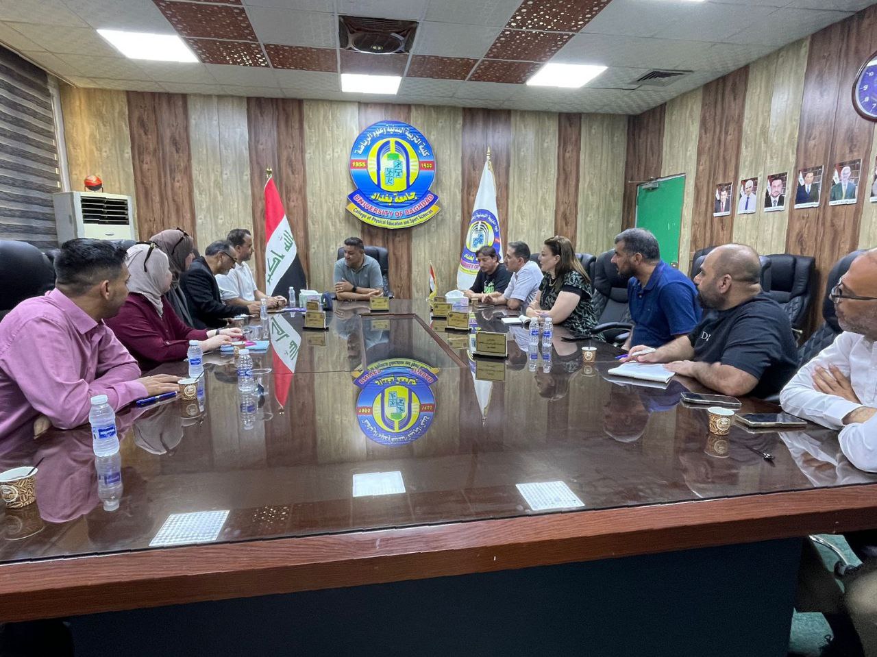 The meeting was chaired by Professor Dr. Sabah Qasim Khalaf, Dean of the College of Physical Education and Sports Sciences, and attended by Dr. Mowafaq Sajet, Director of the Organizations Department at the Ministry of Higher Education; Dr. Ali Abdul Hassan, Director of the Office of the President of the University of Baghdad; Dr. Ali Sadiq Thiyab, Director of the Student Activities Department; Dr. Hassan Ali, Director of the Administrative Affairs Department; Mr. Issam Al-Atabi, Director of the University Monitoring Department; along with several members of the preparatory committee.